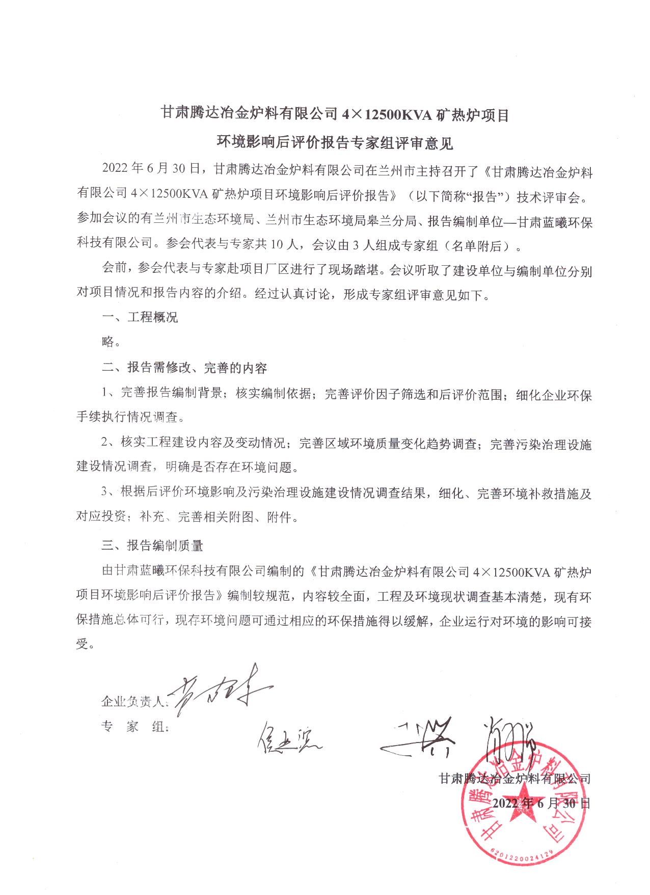 根據(ju)《建設(she)項目環境(jing)影(ying)響后評價(jia)管理辦法(試行)》的有(you)關要求,甘(gan)肅騰達冶金(jin)(jin)爐料(liao)有(you)限(xian)公司(si)委托甘(gan)肅藍曦(xi)環保科技有(you)限(xian)公司(si)編制完成了《甘(gan)肅騰達冶金(jin)(jin)爐料(liao)有(you)限(xian)公司(si)4×12500KVA礦(kuang)熱爐項目環境(jing)影(ying)響后評價(jia)》并通過審查。