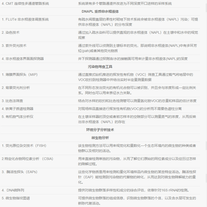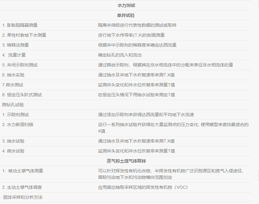 水(shui)文地(di)質數據可以支(zhi)持進行以下這些(xie)計算:平均(jun)線性地(di)下水(shui)流速(su),地(di)下水(shui)流量,污染(ran)(ran)物遷移時(shi)間(jian),污染(ran)(ran)物質量通量和質量排放。這些(xie)場地(di)特征的(de)(de)計算必須要吻合該地(di)區的(de)(de)地(di)質狀(zhuang)況,才能驗證其(qi)水(shui)利條(tiao)件與地(di)表下物理特征的(de)(de)關(guan)系。一些(xie)關(guan)于DNAPL現場調查的(de)(de)水(shui)文地(di)質特征如下: