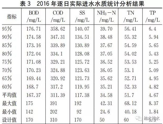 2016年該廠(chang)二期工程處理水(shui)量統計(ji)分析見(jian)表(biao)2,進水(shui)水(shui)質統計(ji)結果(guo)見(jian)表(biao)3。