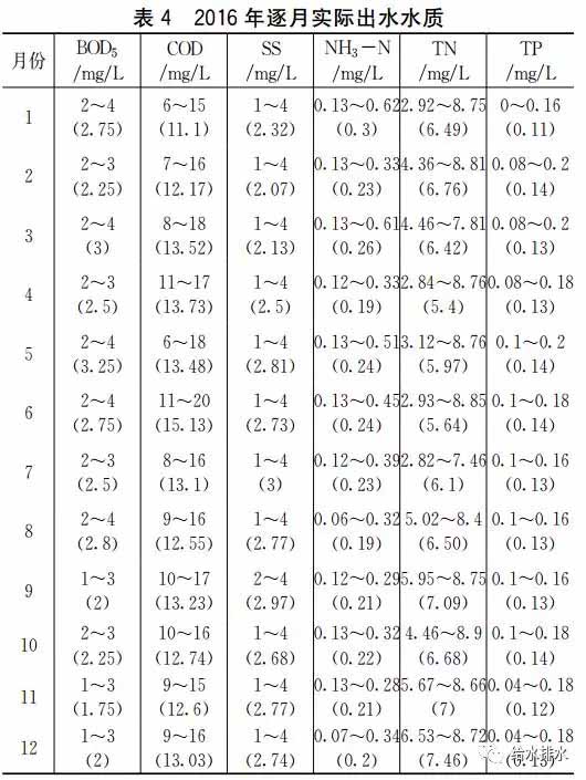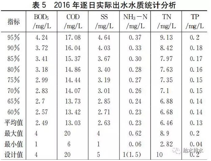 工程2016年逐(zhu)月實際出(chu)水水質見表4;對2016年逐(zhu)日(ri)實際出(chu)水水質進(jin)行數(shu)理(li)統計(ji)分析,結果見表5。